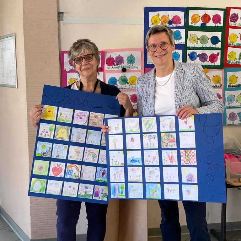 Zum Dank an die Spenderinnen haben die Kinder Plakate überreicht, worüber Frau Gienap und Frau Meinecke sich sehr freuten.
